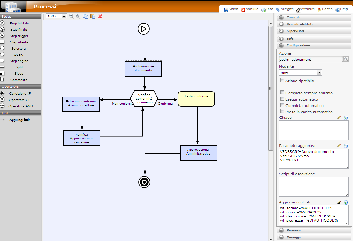 Consente di definire l’ordine e il flusso delle operazioni che gli utenti coinvolti nei processi devono eseguire.