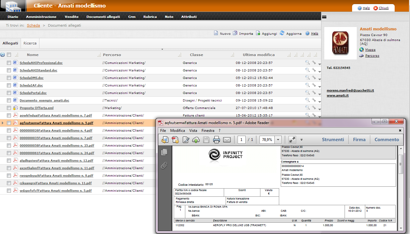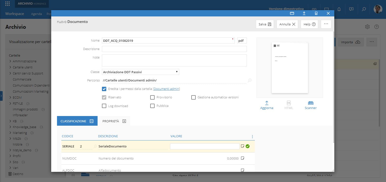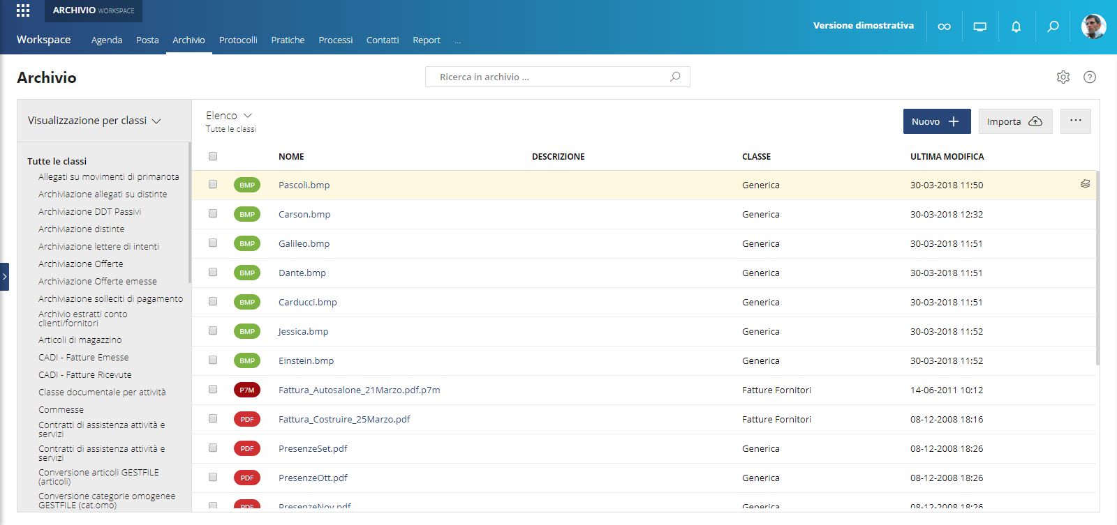 Tramite specifiche classi documentali, liberamente create e gestite, ogni documento viene classificato, organizzato e relazionato a più livelli. Potrai così mettere in relazione il documento con una o più entità (Aziende, Persone, Clienti, Fornitori, Agenti, Contratti, Ordini, Fatture ecc.).